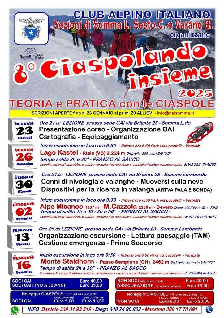 Le lezioni teoriche dello stage CAI “Ciaspolando Insieme”, si terranno presso la Sede sezionale di Somma Lombardo, in via L. Briante 23, nelle serate del 23 e 30 gennaio e 13 febbraio, mentre le tre escursioni didattiche sono programmate: